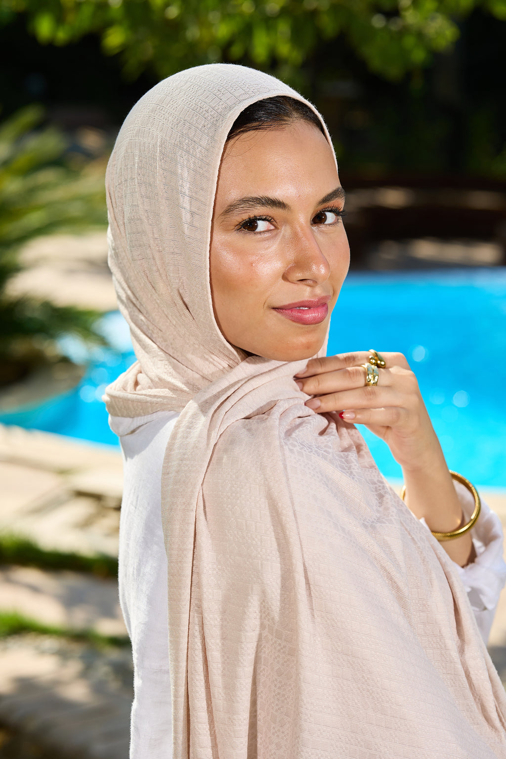 Make a sophisticated statement with this stunning light Kashmir doodles Kuwaiti viscose jacquard hijab from ATRAB's exclusive collection. Featuring beautiful light Kashmir doodle patterns that create a playful and artistic design, this piece adds a unique touch to your modest wardrobe with the luxurious comfort of Kuwaiti viscose jacquard fabric.